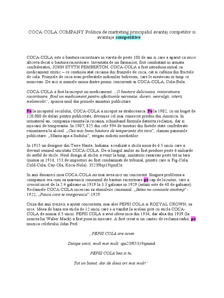 Coca Cola Company Politica De Marketing Principalul Avantaj Competitiv Si Avantaje Competitive